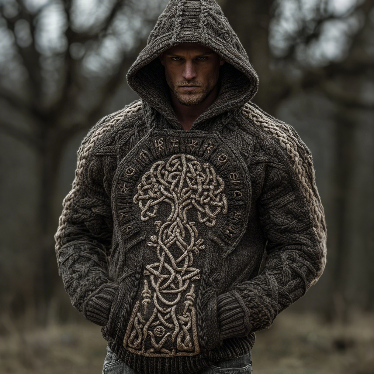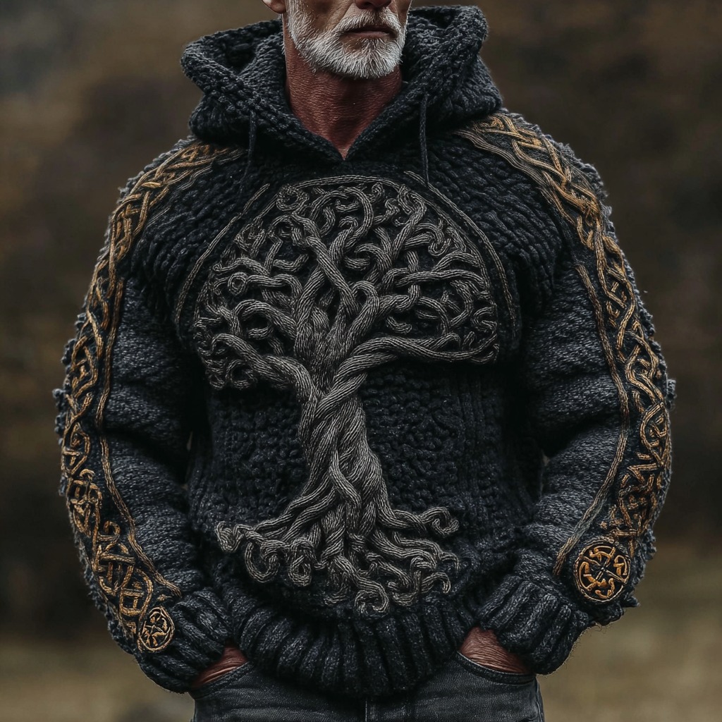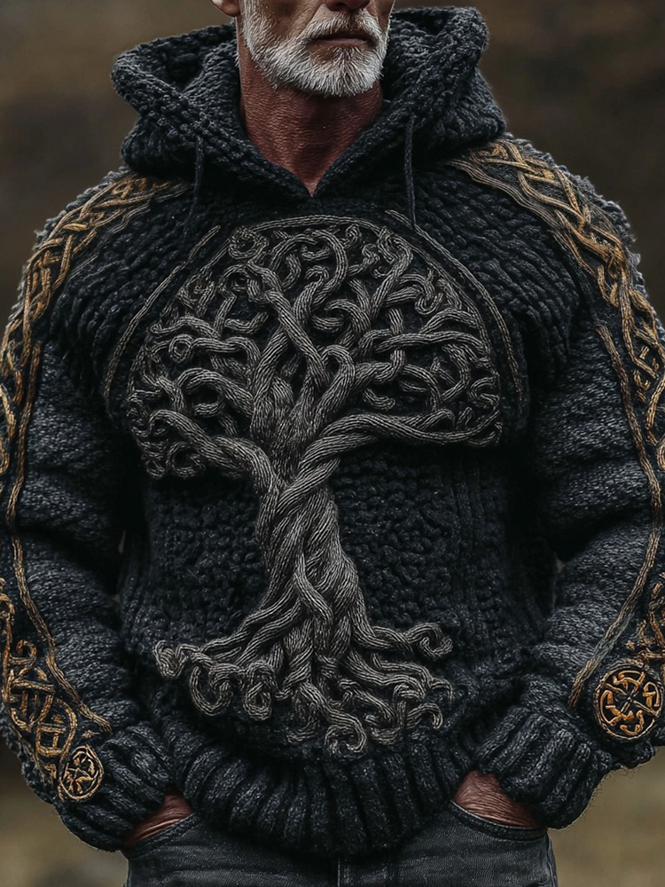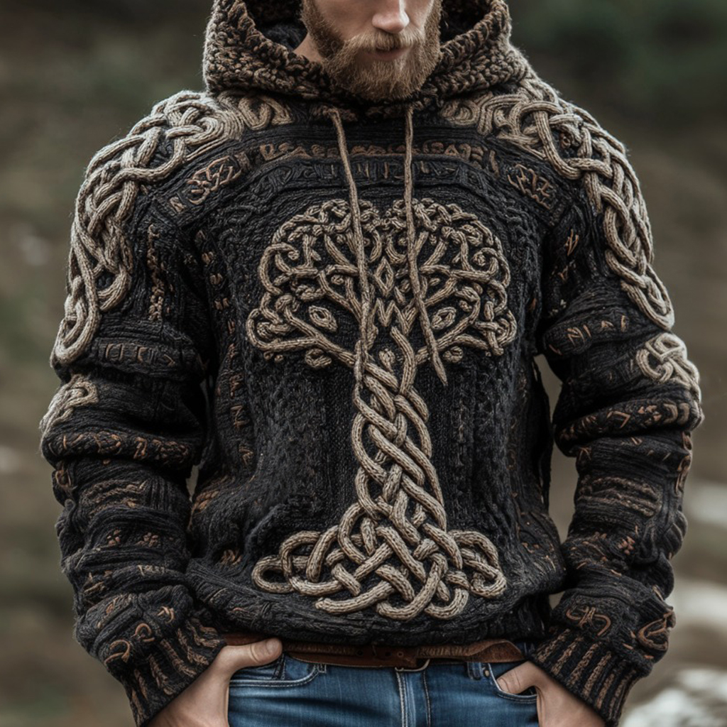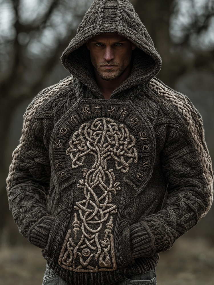 Viking Tree Of Life Celtic Knot Rune Art Chunky Knit Jacquard Hoodie