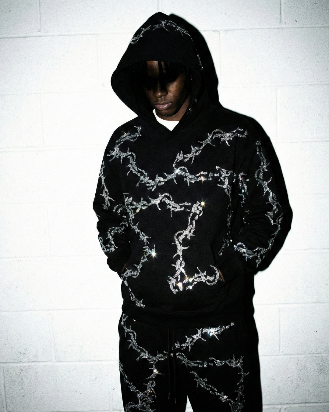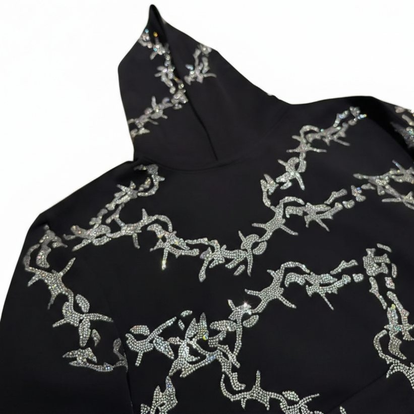 Elevate your wardrobe with the VYBES Rhinestone Thorn Hoodie, perfect for those who dare to shine day or night. Handcrafted with extreme attention to detail this is a piece that will turn head and get compliments like you've never seen before.