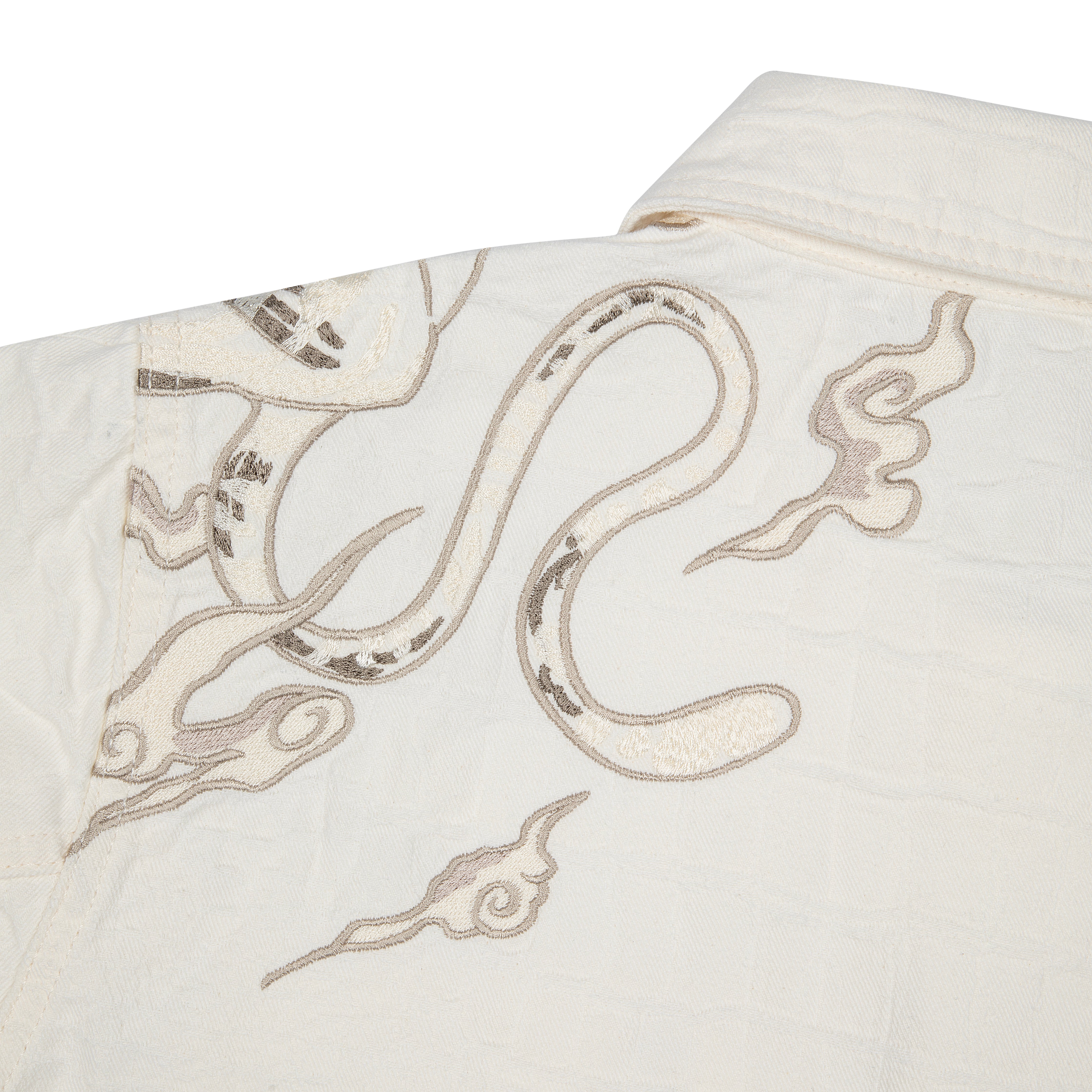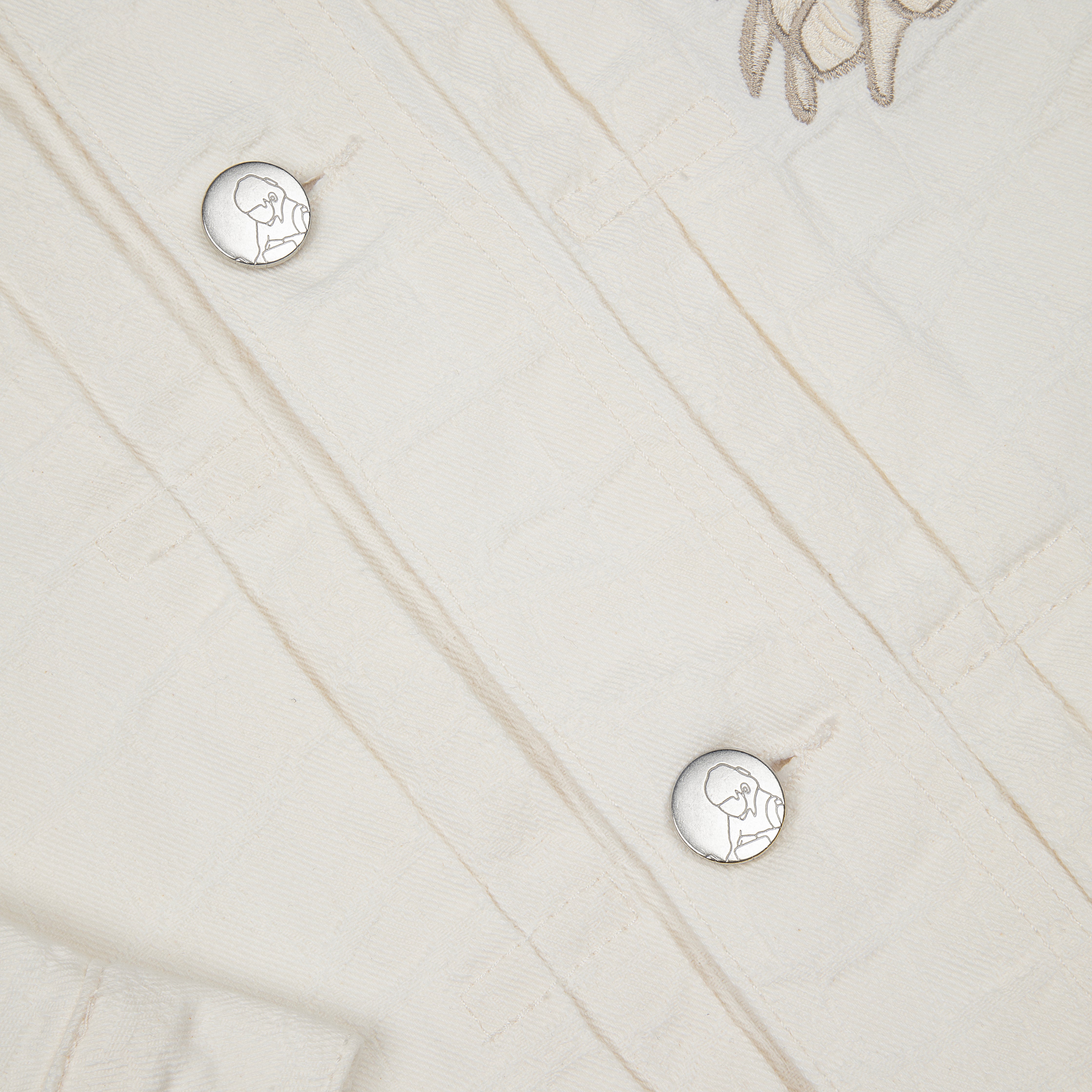 13oz jacquard patterned denim / 100% cotton / embroidery on front and back / custom buttons / fits true to size